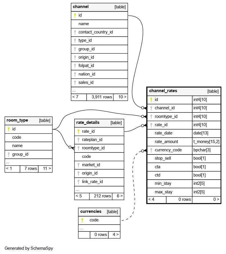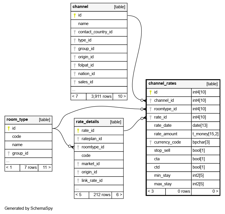 | unq_channel_rates | Must be unique | Asc/Asc/Asc/Asc/Asc | channel_id + roomtype_id + rate_id + rate_date + currency_code |