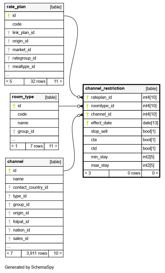| pk_channel_restriction | Primary key | Asc/Asc/Asc/Asc | rateplan_id + roomtype_id + channel_id + effect_date |