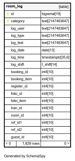 | room_log_pkey | Primary key | Asc/Asc | category + id |